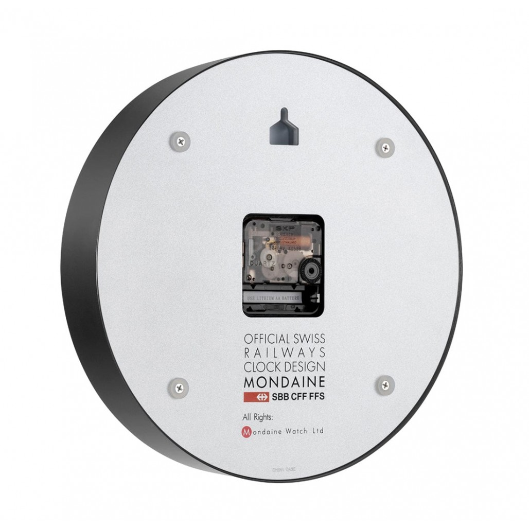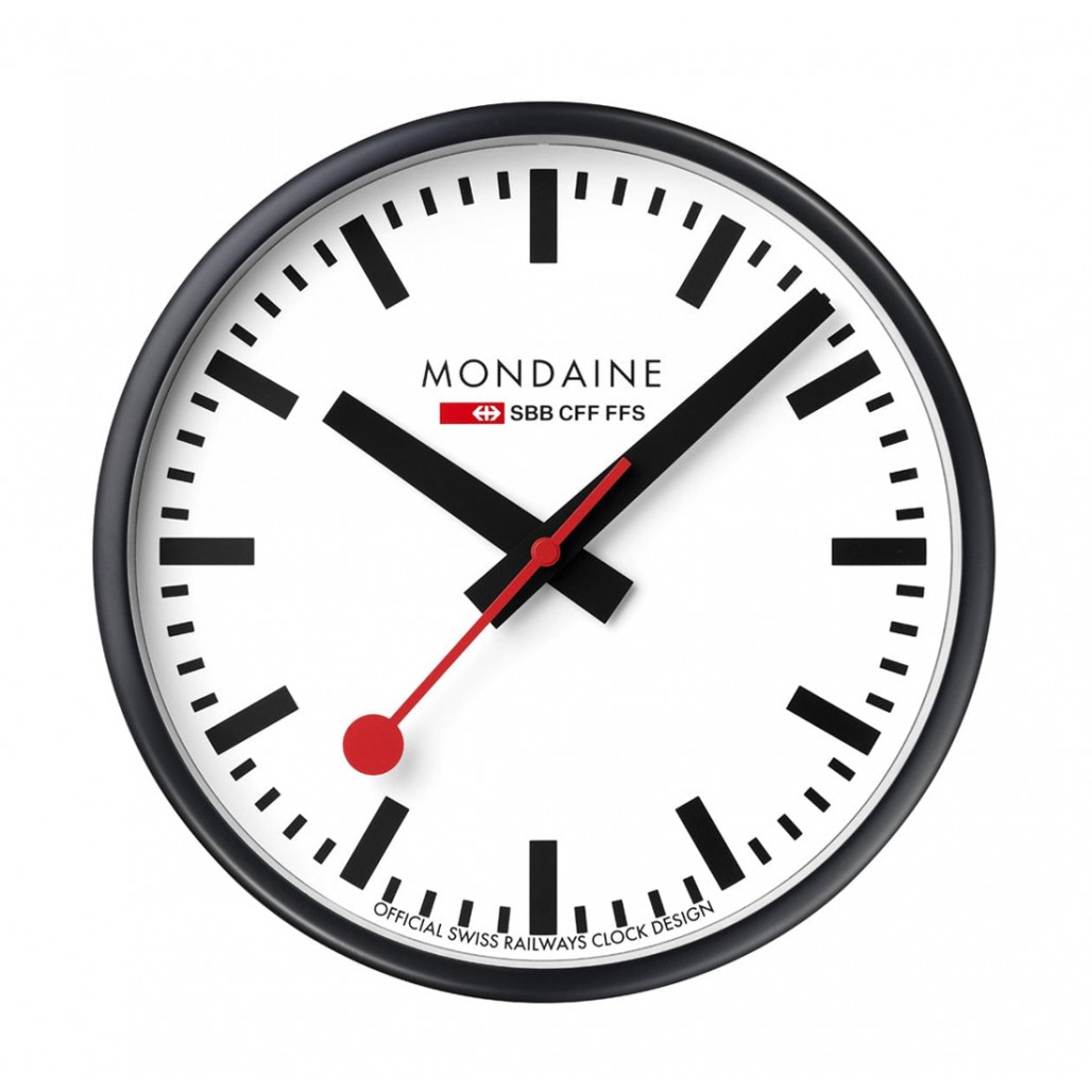Väggklockor i stationsmodell syns idag i många tillverkares sortiment, men det finns bara ett original! År 1944 fick formgivaren Hans Hilfiker och tillverkaren Mondaine i uppdrag av Schweiz nationella järnvägsbolag SBB att ta fram den klockan, som senare skulle visa sig bli ett klassiskt designobjekt. Väggklockans urtavla har genom alla år haft samma design och skyddas på denna modell av ett mineralglas och omsluts av en robust ram i matt svartfärgad aluminum. Kort och gott - en väggklocka för den designmedvetne.